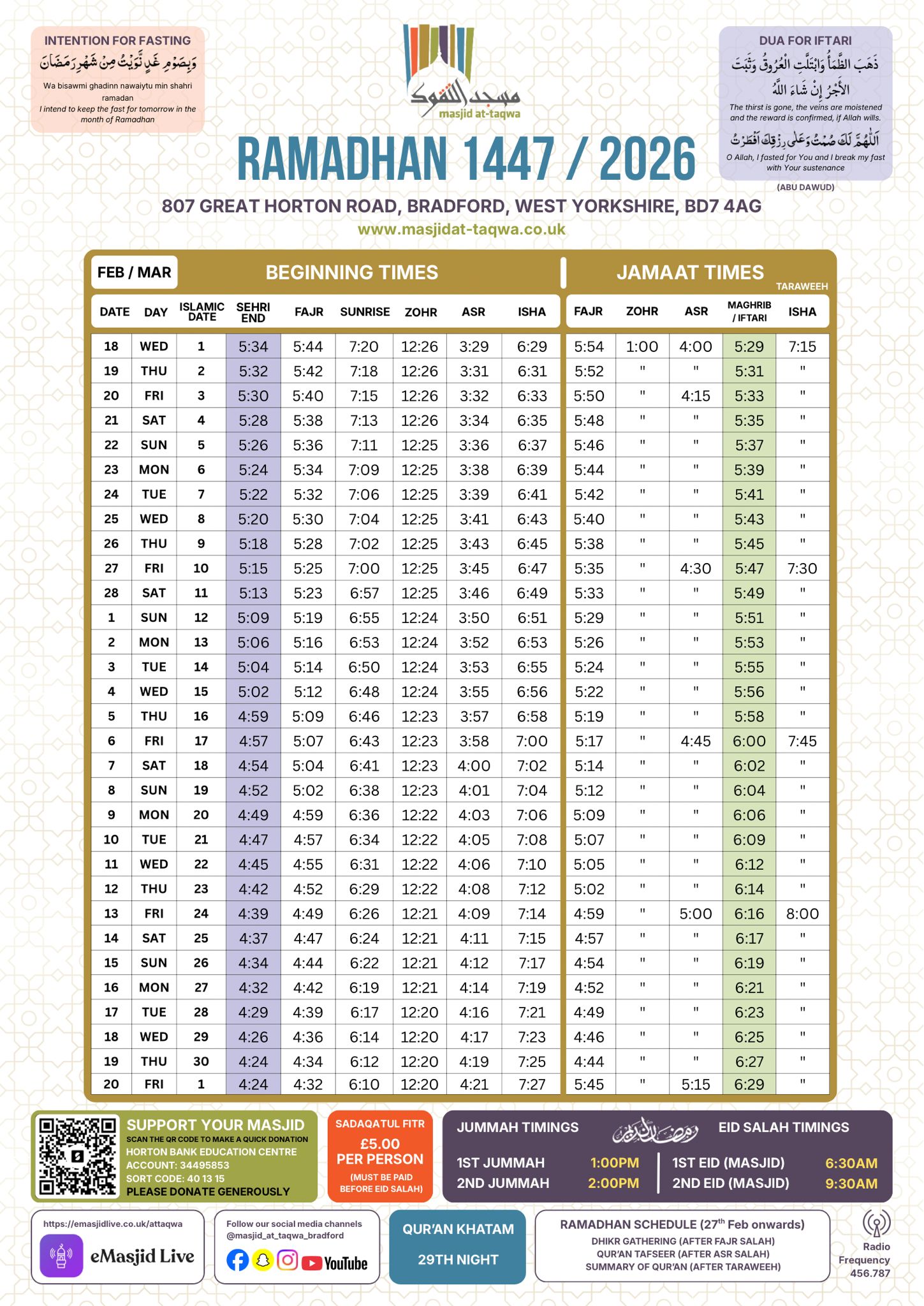 View daily prayer times and Jamaat times. Download the monthly timetable for offline access.